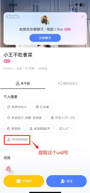需要注意的是,陌陌的UID可通过手机端查看,具体方法看下图